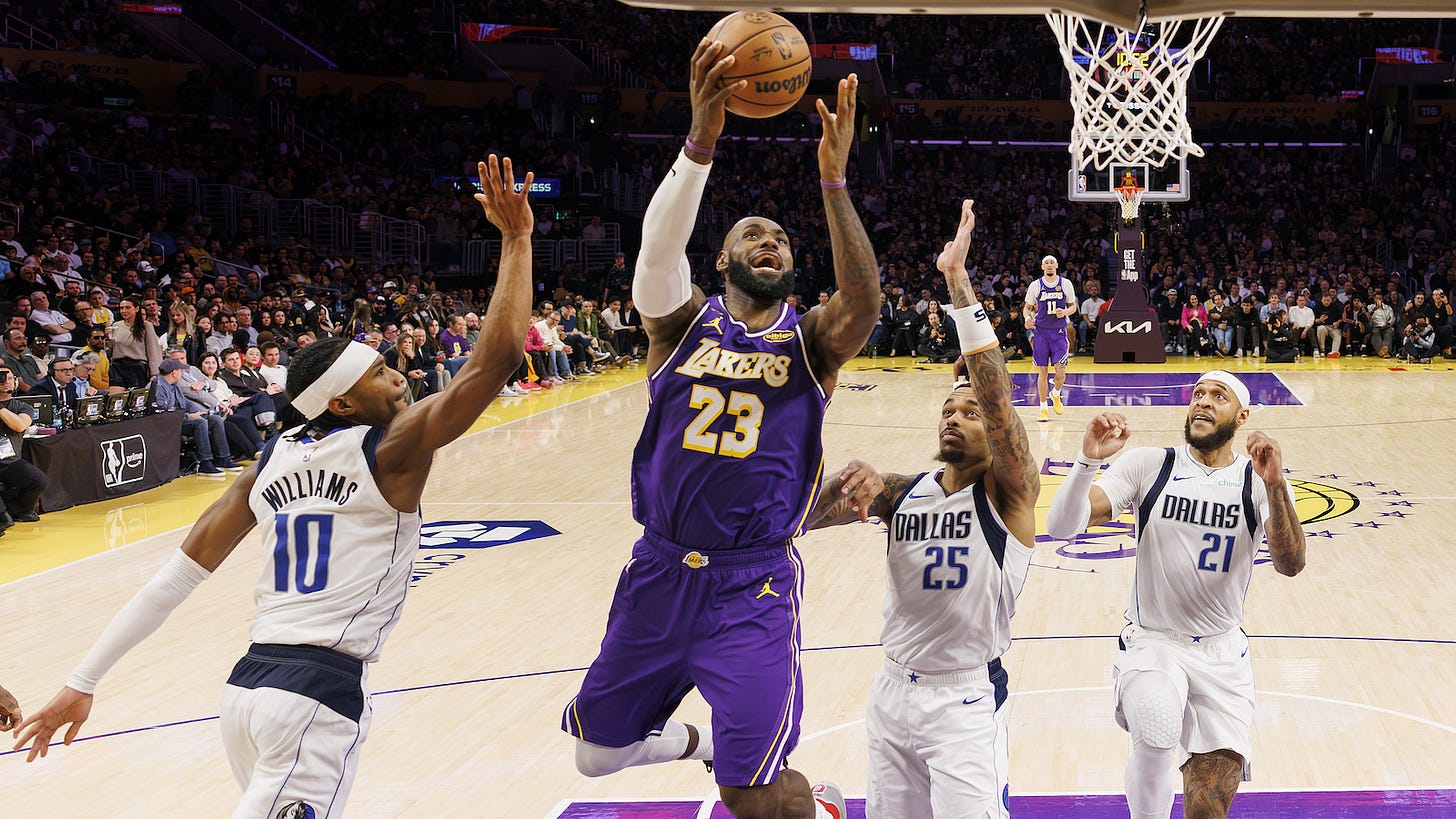 LeBron James became the oldest player in NBA history to record a triple-double, compiling game highs of 28 points, 10 rebounds, and 12 assists as the Los Angeles Lakers routed the Dallas Mavericks 124-104. James shot 10-20 from the field and 6-7 from the free throw line. He also blocked one shot and did not commit a personal foul in 35 minutes played.