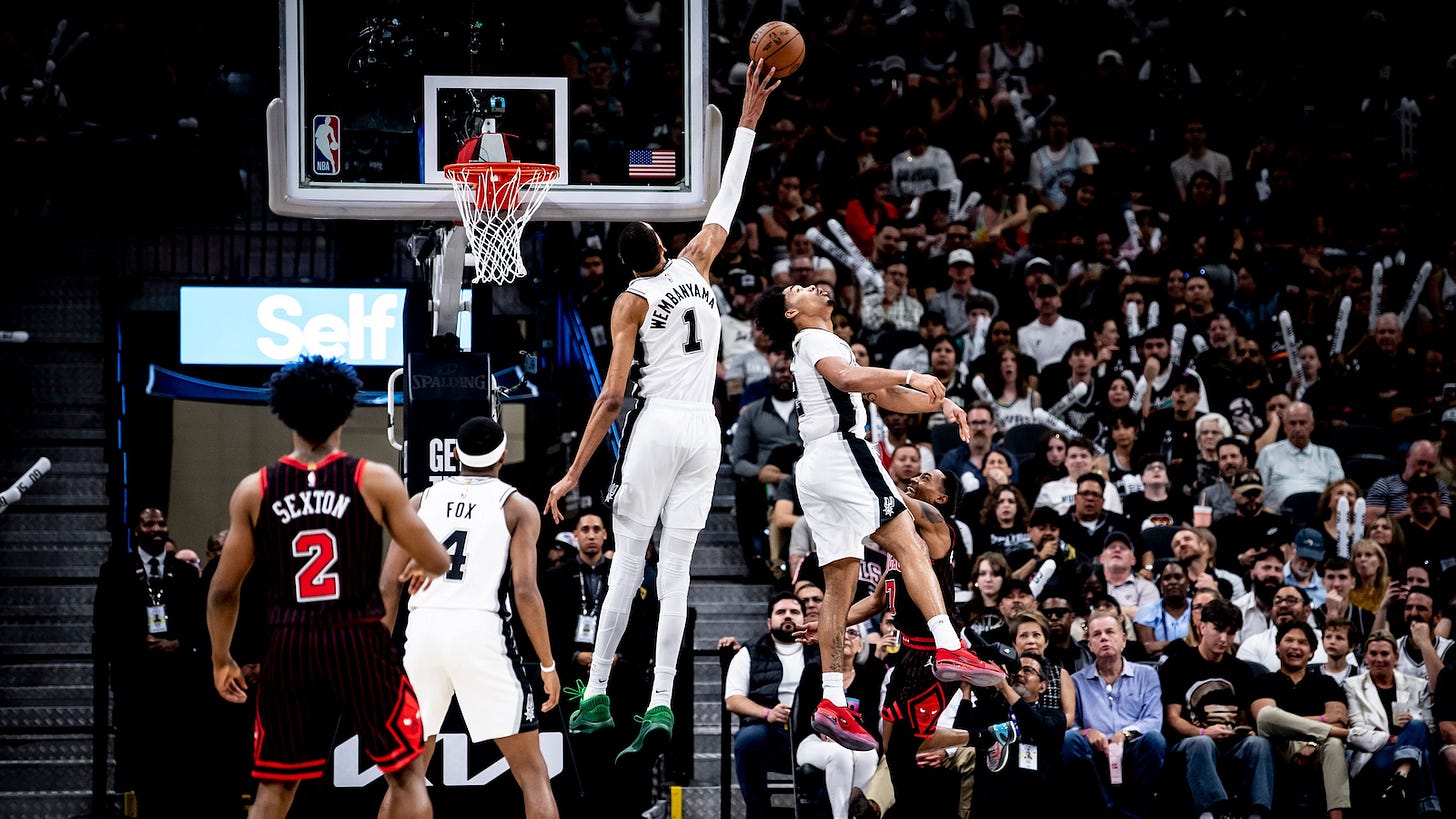 Victor Wembanyama produced game highs of 41 points (also a season high) and 16 rebounds in the San Antonio Spurs’ 129-114 win over the Chicago Bulls. Wembanyama shot 17-27 from the field, hitting three of his six 3-point attempts. He also recorded four assists, a game-high three blocks (tied with Matas Buzelis), and one steal in 31 minutes played.