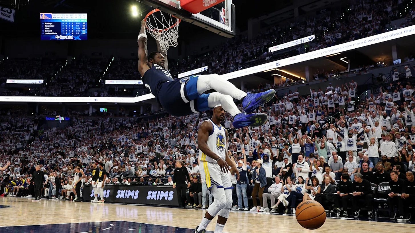 Jaden McDaniels scored 16 points on 7-10 shooting from the field as the Timberwolves blew out the Warriors. McDaniels also produced game highs of three steals (tied with Edwards) and three blocks. He was charged with just one turnover and one personal foul in 33 minutes of court time.