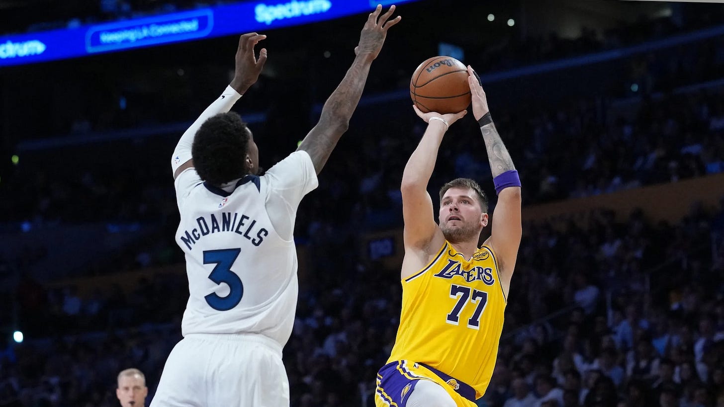 Luka Doncic produced game highs of 49 points and 11 rebounds as the Los Angeles Lakers beat the Minnesota Timberwolves 128-110. Doncic shot 14-23 from the field (5-12 on threes) and 16-19 from the free throw line. He also dished out eight assists in 35 minutes of playing time.